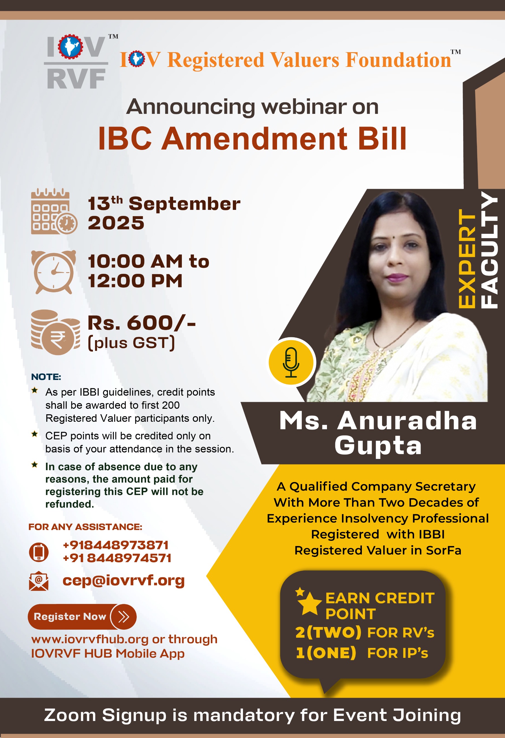 CEP Webinar On “Judicial Pronouncements and Professional Opportunities for Valuers” by Ms. Anuradha Gupta From 02:00 PM to 06:00 PM 14th Mar 2026 Ms. Anuradha Gupta New Delhi Online Register