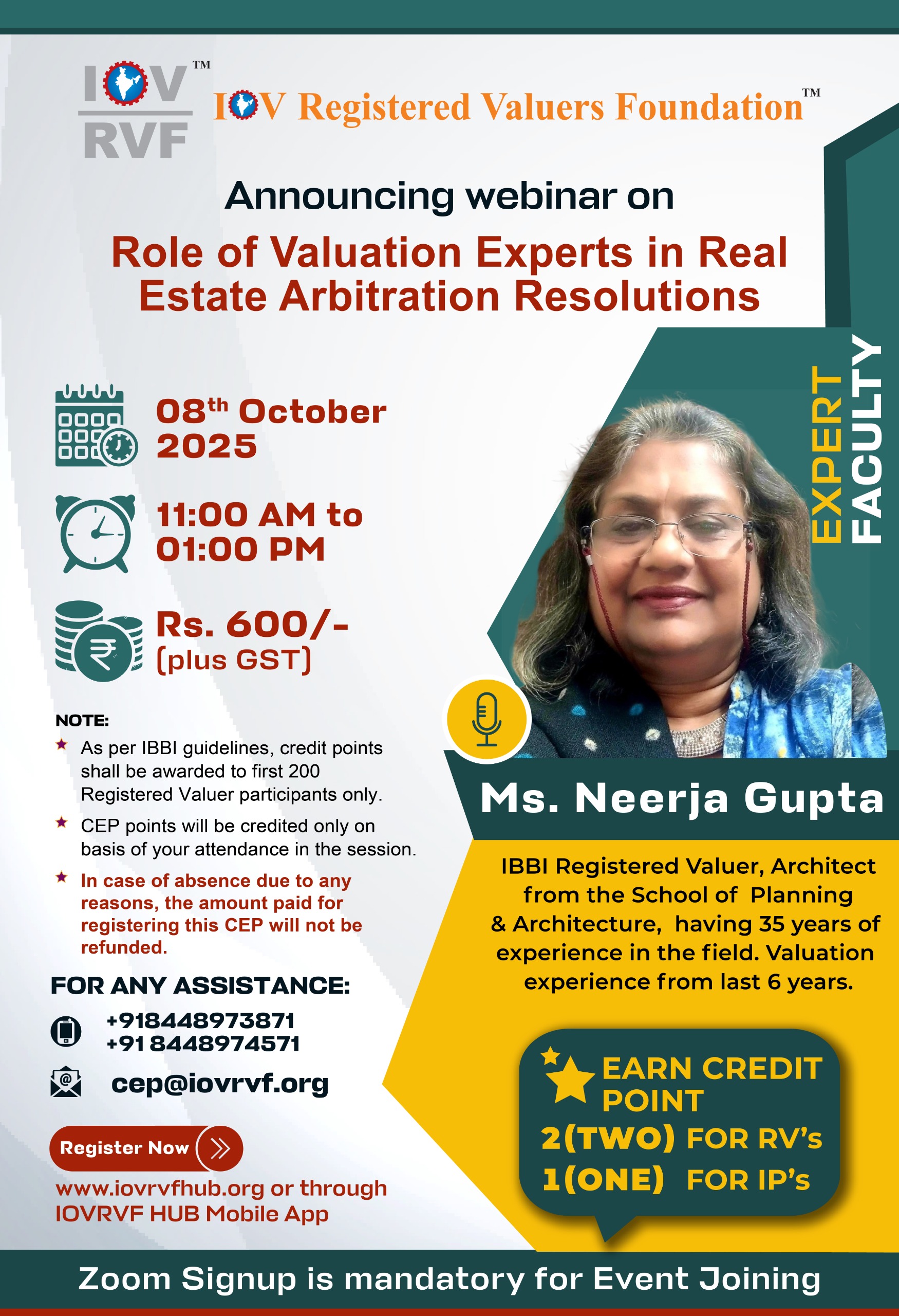CEP Webinar On "Role of Valuation Experts in Real Estate Arbitration Resolutions" by Ms. Neerja Gupta Agarwal From 11:00 AM to 01:00 PM | 08th Oct 2025 | Ms. Neerja Gupta Agarwal | New Delhi | Online | Register |